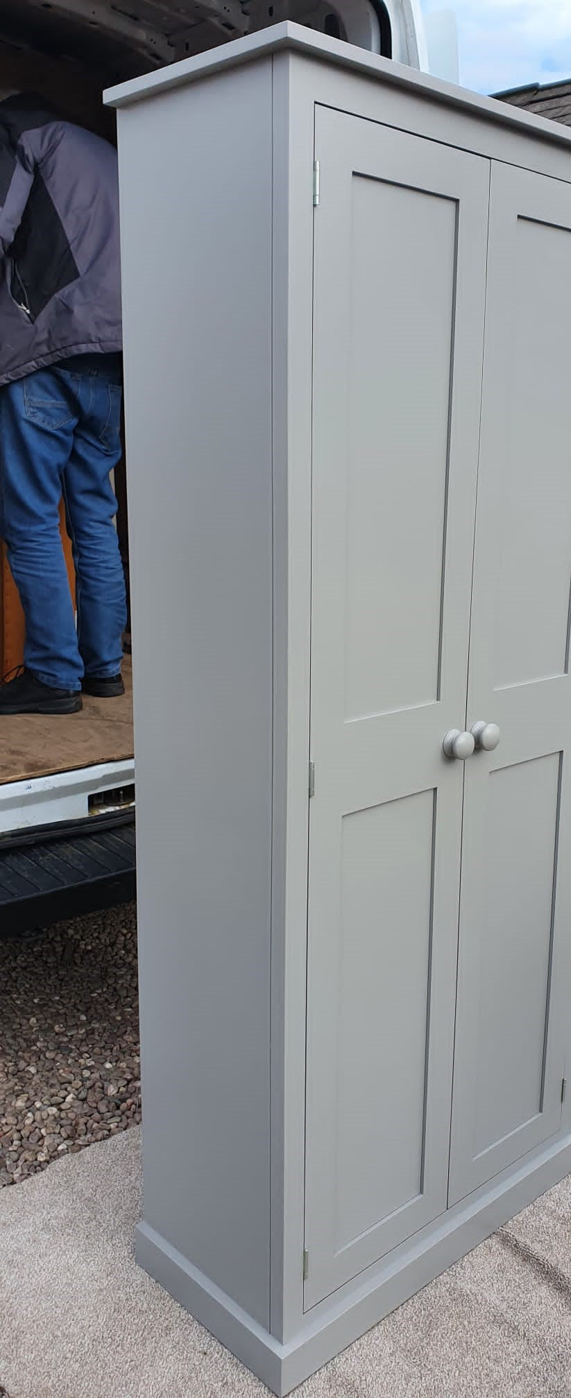 To be screwed together by yourselves in your home as ONE as this item does break down into 2 Cupboard Sections for ease of getting it on to the van and also into your home! It is too big and heavy to manouver as 1 piece.